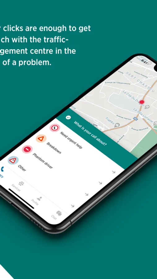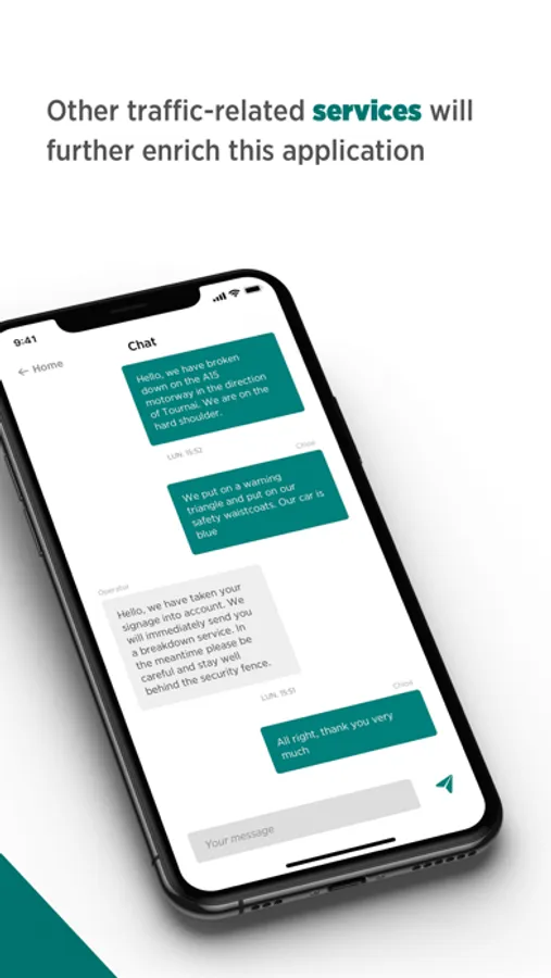 In particular, this includes a call function, which replaced emergency call points in the event of a breakdown: in just a few clicks, the user can contact the road-traffic-management centre. Written communication with the operator is also possible in any language (automatic two-way translation system). Edwige geographically locates the user to facilitate emergency intervention. It also makes it possible to report a phantom driver or any other concern (blockage, vehicle on fire, presence of an animal, etc.) to the traffic-management centre.