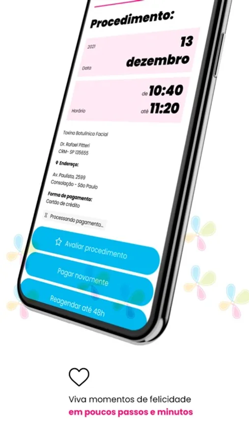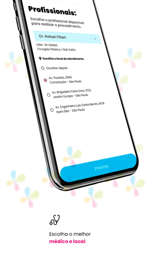 Pelo aplicativo, você pode escolher procedimentos, todos com médicos especializados de um jeito fácil, descomplicado, além de agendar o local, dia e horário que preferir.