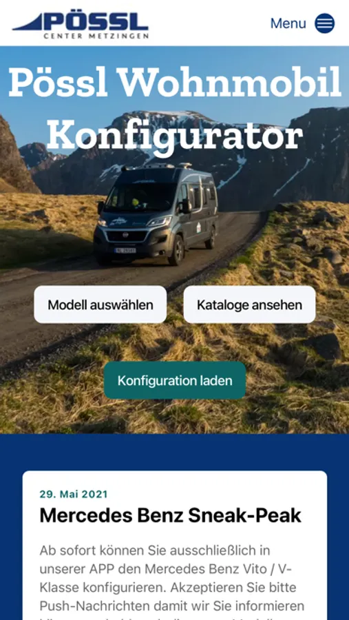 Pössl Konfigurator - WOMO Online - Konfiguration aller Pössl Modelle. Nutzen Sie den Pössl Online-Konfigurator und erhalten Sie umgehend Ihren persönlichen Angebotspreis für Ihren neuen Pössl Camper. Alle Abhängigkeiten, Ratschläge, Preise und Gewichte haben wir bedacht. So können Sie sorglos gleichfalls vermehrt konfigurieren und Ihr Pössl Traum-Wohnmobil finden.