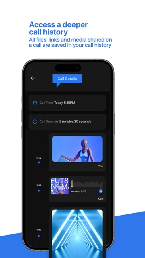 ACCESS A DEEPER CALL HISTORY. Ever been presented with a deck on a conference call, only to lose it after the call ends? Not with FYI—your app automatically saves all files shared on a call in your private history, so you can access them again any time. Just tap on a “CALL CARD" in your chat thread, or access it from your call logs. No need to ever send a follow-up message for that missing pitch, mp3 or doc!