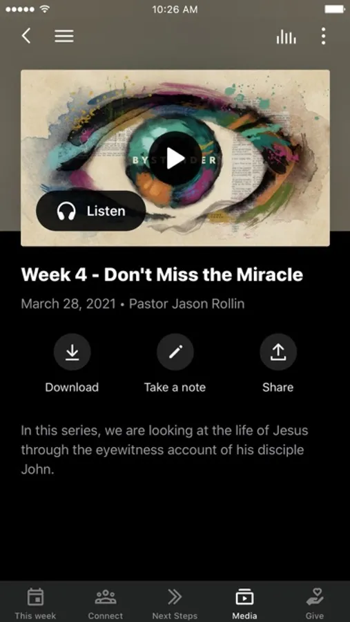 This app will help you stay connected with the day-to-day life of our church. With this app you can: watch or listen to past messages; stay up to date with push notifications; share your favorite messages via Twitter, Facebook, or email; and download messages for offline listening.