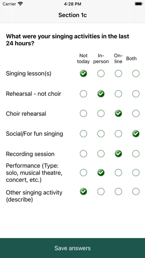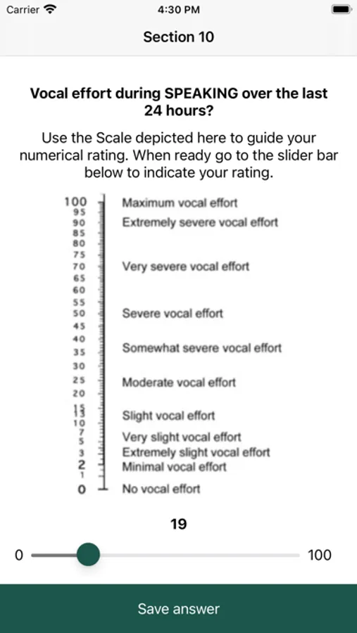 How a person uses their voice and their daily behaviors can impact the voice. With this app users can track several aspects of voice use and lifestyle on a daily basis. Regular tracking might help a person understand how certain voice uses or behaviors positively or negatively impact their voice.