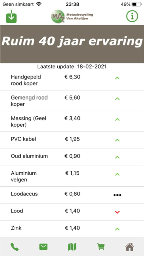 Op de hoogte blijven van de nieuwste inlever prijzen van bijvoorbeeld oud ijzer? Download de app voor de actuele schrootprijzen van Metaalrecycling van Akelijen. De prijzen worden dagelijks vernieuwd.