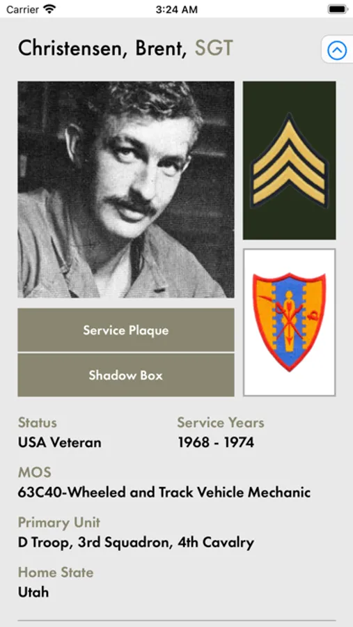View complete Service Histories including their Medals and Awards, Badges and Insignia, Basic Training/ Boot Camp, Unit Assignments, Combat/ Non-Combat Operations, and all Training Schools and Courses.