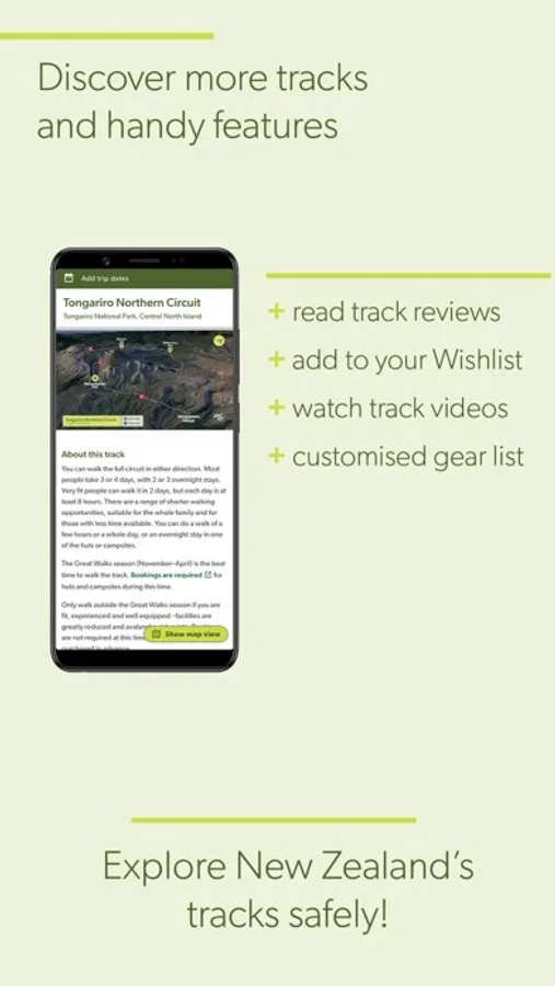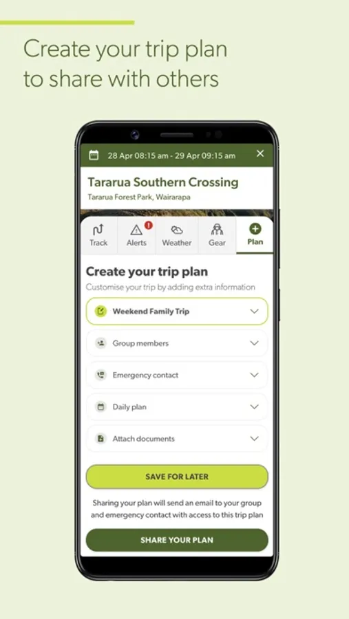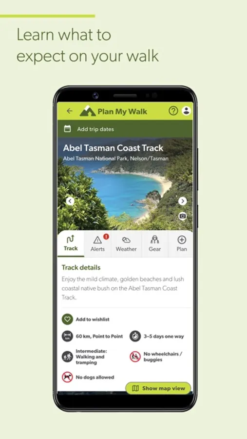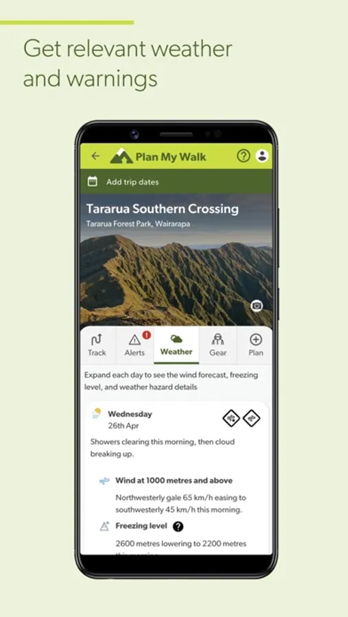 Plan My Walk will help you plan and prepare for your NZ outdoor adventure. Providing you with a comprehensive database of walking/tramping tracks across New Zealand, you can plan your adventure with confidence. Select a track and enter your trip dates to receive specific alerts, weather warnings and watches, a track-specific weather forecast, and an interactive gear list. You can build a trip plan by adding contacts who are joining you, designate an emergency contact, upload trip notes or documents. Once your trip plan is complete you can share it with your contacts, and off you go!