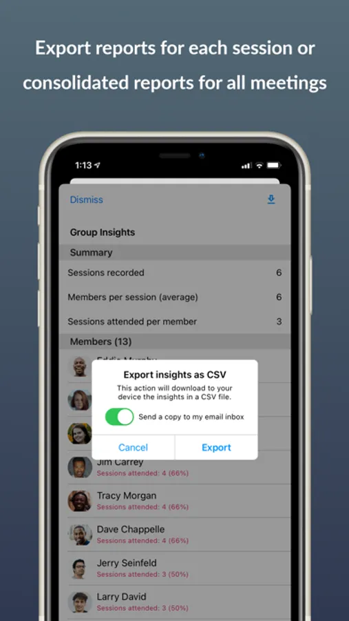 • Exportable data: All attendance records can be exported to CSV files, both on a per-session as well as consolidated basis