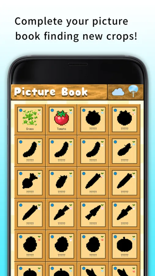Another, you are going to discover the new crops. The new crops are changed with influence around situation, weather and season until it becomes a fruit. You harvest the crop, you can check it on the picture book. Discover the kind of 70 crop and let's complete the picture book.