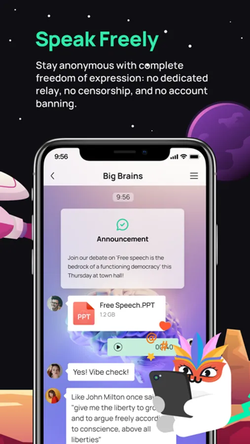 E2EE voice calls, video calls, chat groups with no limit on the number of participants, file transfer without a size limit, clean and clear UI design, multi-device login, dark and light mode themes, decentralized payments, disappearing messages, and more for you to explore!