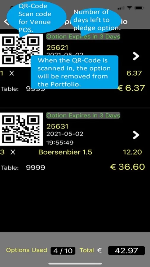 2. Place item purchase options which are stored in the users personal portfolio and can be redeemed at the venue within a validation period per QR-code scan.