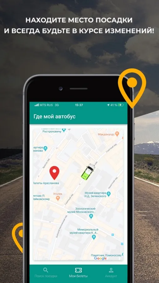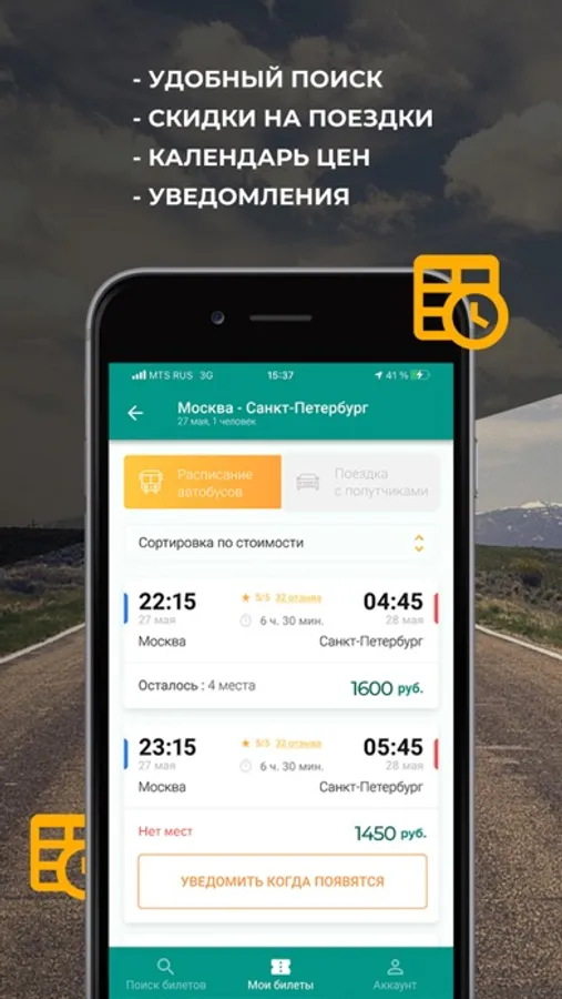 ◦ Бронирование без предоплаты, низкие цены на автобусные билеты, уведомление о появлении свободных мест на интересующий рейс.