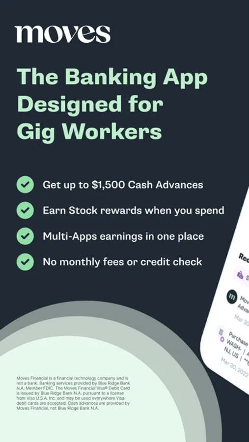 Moves Financial is a financial technology company and is not a bank. Banking services are provided by Blue Ridge Bank N.A; Member FDIC. The Moves Financial Visa® Debit Card is issued by Blue Ridge Bank N.A. pursuant to a license from Visa U.S.A. Inc. and may be used everywhere Visa debit cards are accepted. Cash advances are provided by Moves Financial, not Blue Ridge Bank N.A.