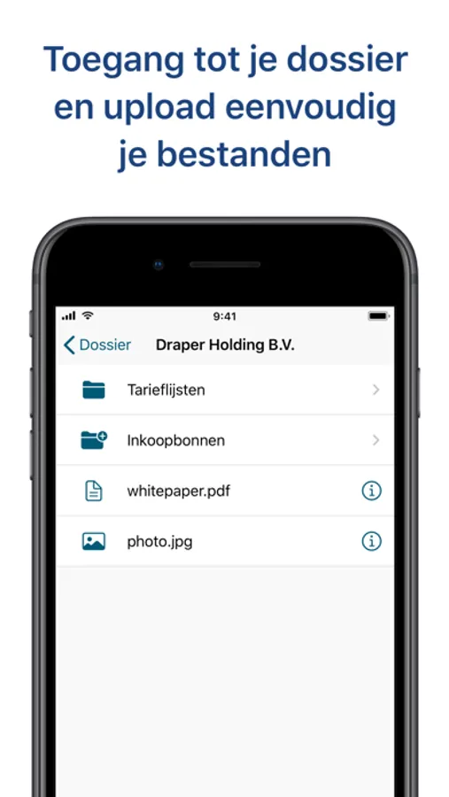 Je kunt in de Mijn HLB Witlox Van den Boomen app op ieder moment en overal zelf je dossier inzien, specifieke documenten bekijken en deze eventueel opslaan of openen in andere apps. Bovendien kun je bestanden als facturen en contracten makkelijk delen met je accountant, door er een foto van te maken of ze te uploaden vanaf je telefoon.