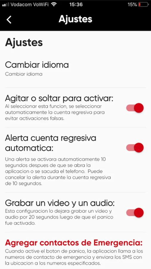 Alerta instantanea a 5 contactos predeterminados y a una central de monitoreo 24/7. Notificación de posición GPS: Notificación automática de posición mediante el GPS del celular. Alerta con video y voz: Envío de video y voz del momento en que se obtuvo el pánico. Central de Monitoreo: