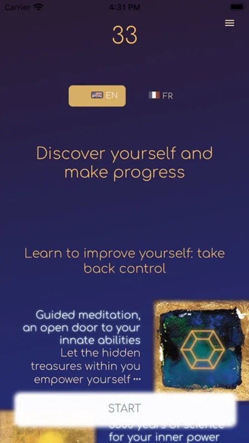You will find series of 33 cards on different themes, each one proposing a guided meditation, customizable and adapted in real time, drawings and explanations from the authors' work, like the books "33 treasures" and "33 meditations". Regularly, new cards will offer new tools to discover yourself, and new meditations.
