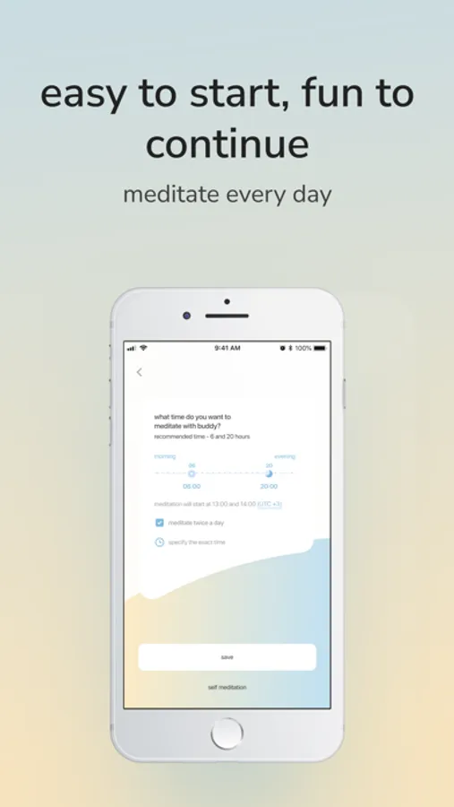 The application is as simple as possible to use, making it easy to start and interesting to continue meditating daily. It implements mechanics similar to a Tinder. You fill out a questionnaire and the application connects you with the most relevant meditation buddy at a set time every day. You can see each other, but not hear each other, as each person enters their own meditation with or without audio accompaniment.