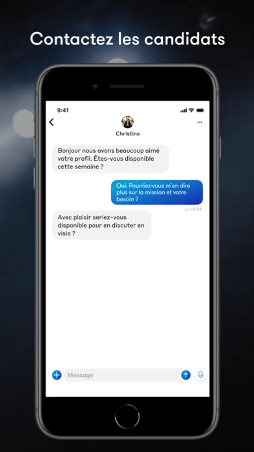 Backstage Pro vous permettra de faire vos sélections grâce à des filtres précis et exhaustifs et de communiquer directement avec les profils que vous aurez sélectionnés soit par chat, soit par visio directement dans l’application
