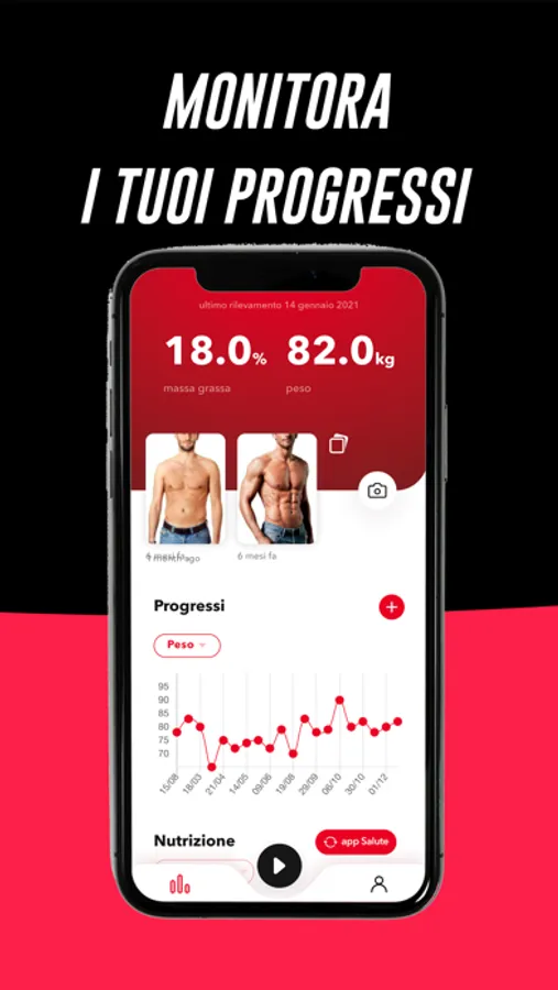 Avrai sempre sotto controllo la tua attività fisica: potrai visualizzare quali esercizi sono previsti nel tuo piano di allenamento, i tuoi progressi e come cambia il tuo fisico nel corso del tempo.