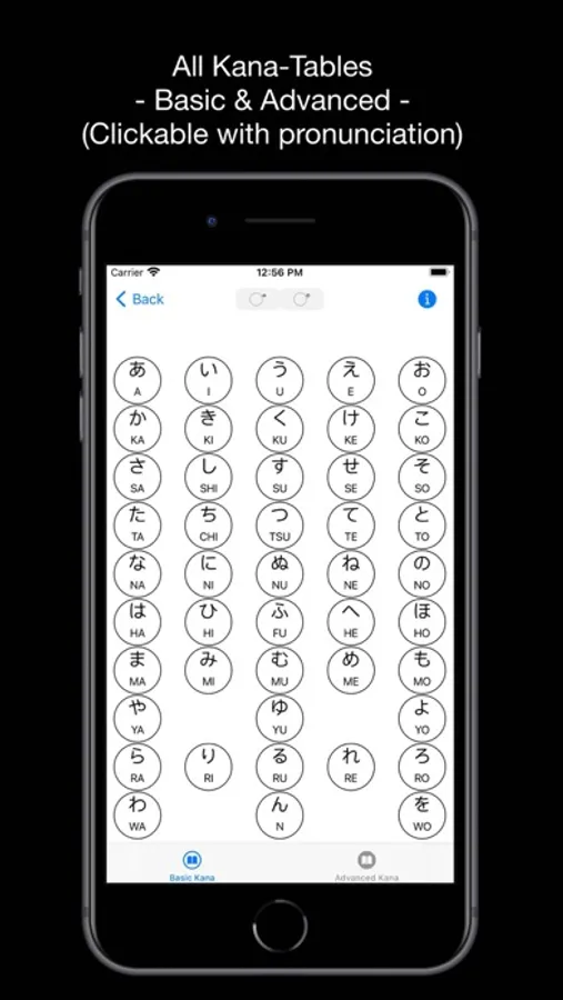 Switch between Hiragana & Katakana with one tap on the Logo. You can look up the Kana-Tables and see everything you need in a clean structure. By clicking on a Kana-Symbol you will hear its correct pronunciation.