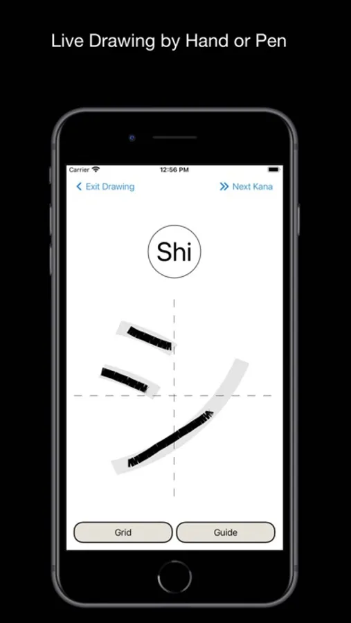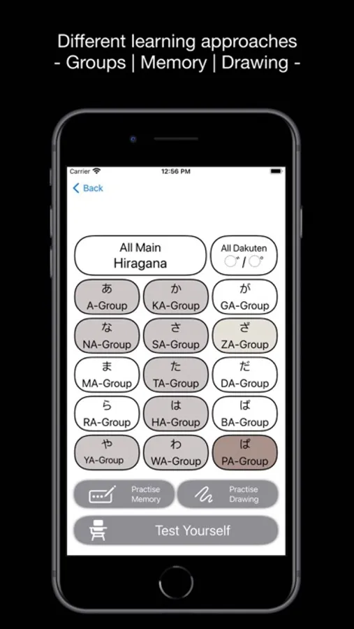 Start your learning journey by choosing the Kana-Groups you want to learn. You can also choose between different learning approaches (Memory & Drawing). You can draw the corresponding Kana-Character with your finger or pen to improve your muscle memory.