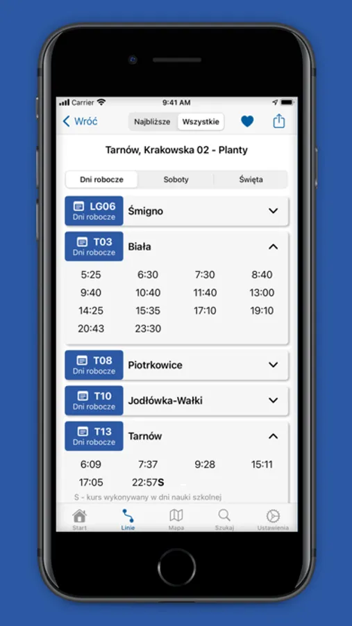 • rozkłady jazdy dla poszczególnych przystanków z podziałem na: dni robocze, soboty, święta,