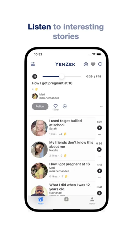 YenZek is a social audio-posting app that allows you to meet new people by sharing interesting stories that has happened in your life.