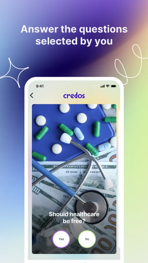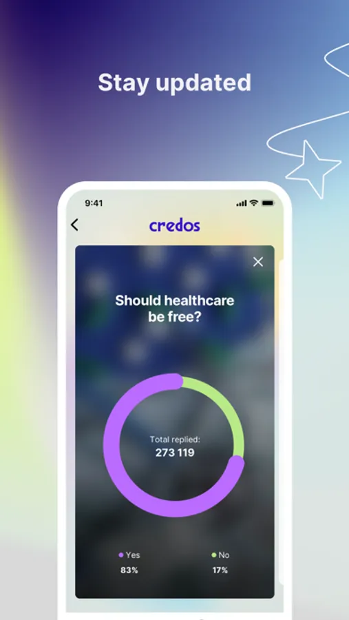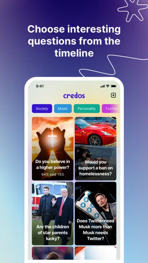 In Credos people give simple “Yes or No” answers to popular questions and controversial statements, while you can observe statistically how an overall public perception is shaped.