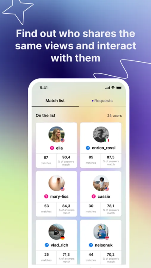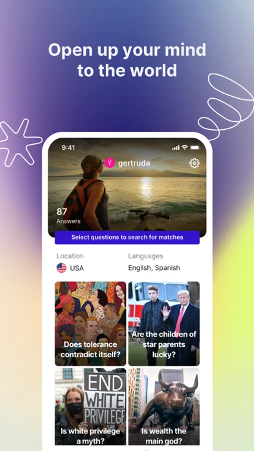 By answering questions, you will discover people with matching views. Credos will bring you together. You can continue to communicate with them in chat, and if you wish, in life.