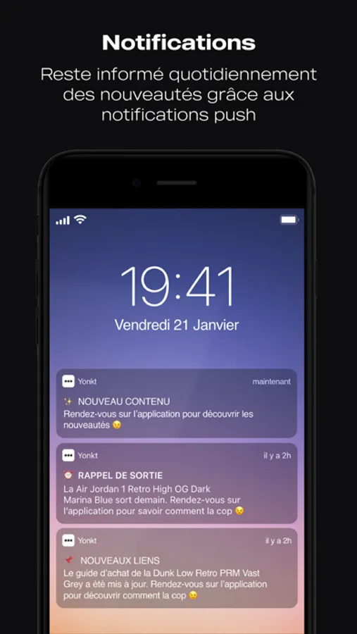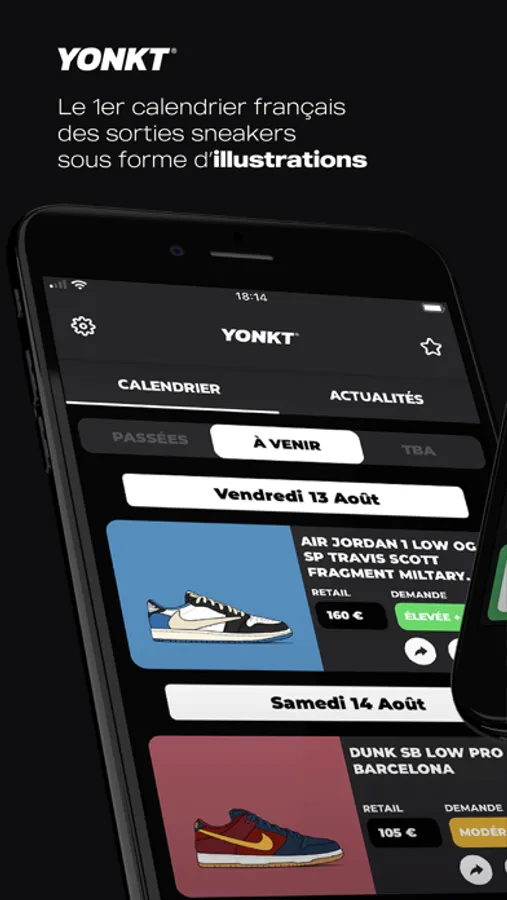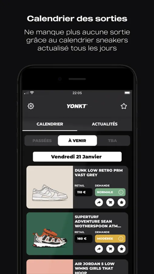 Tu ne veux plus perdre de temps à chercher les différents moyens de cop ta future paire ? Alors l’appli Yonkt est faite pour toi ! Elle va t’accompagner tout au long de ton processus pour mettre toutes les chances de ton côté et ne plus louper aucune sortie sneaker.
