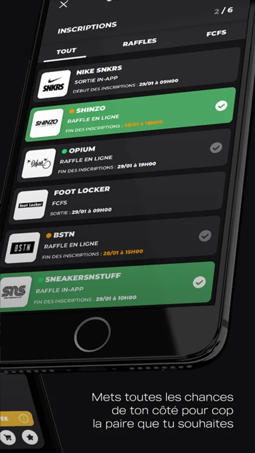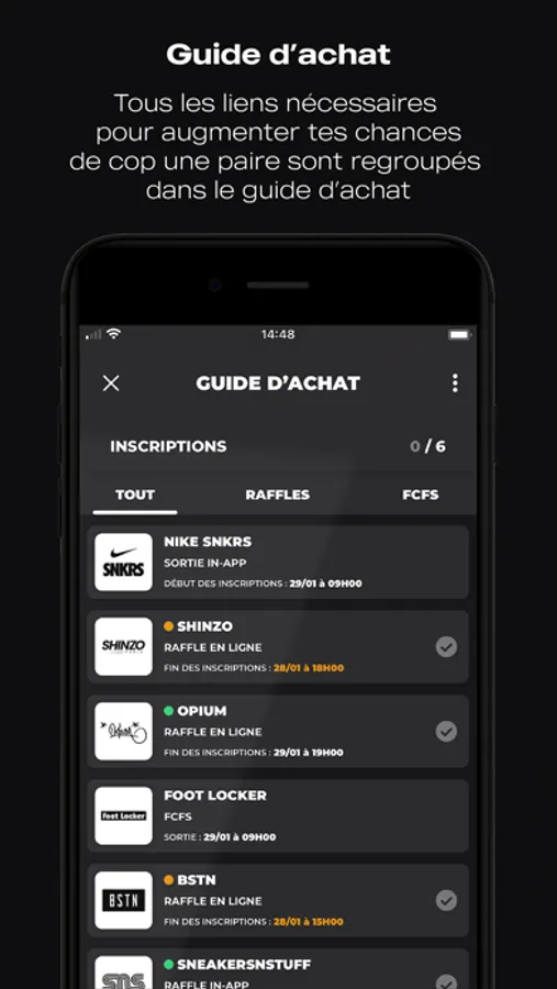 L’app Yonkt te permet d’accéder à tous les liens des shops qui proposent la paire que ce soit sous forme de Raffles, en Premiers Arrivés Premiers Servis ou des Revendeurs.