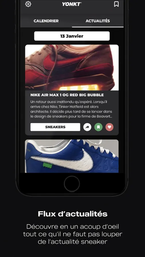 Avec le flux d’actualités, tu pourras rester constamment à jour avec le monde de la sneaker. Il te sera également possible de le personnaliser en laissant apparaître ou non des médias sélectionnés par nos soins pour que ton flux te corresponde parfaitement. Tu peux même ajouter des articles pour les lire plus tard.