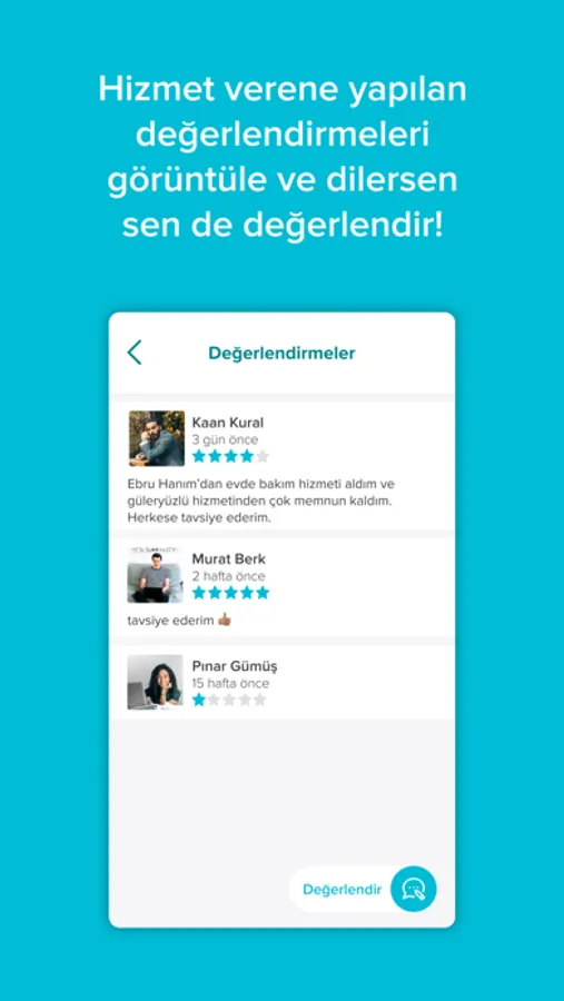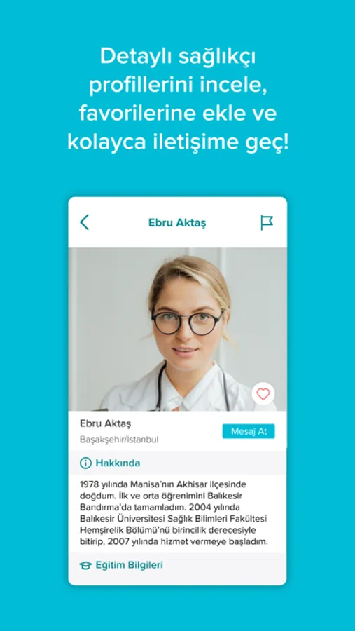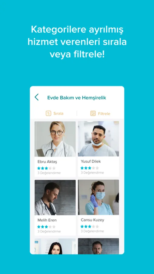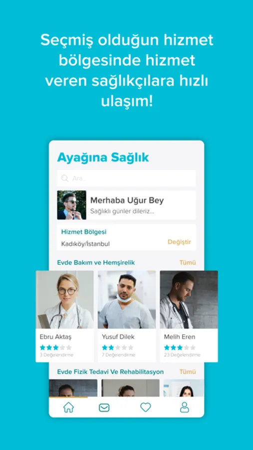 Bazen yaşlı bir aile bireyimizin bakımı, bazen bir hastamızın bakımı, bazen formumuzu korumak adına diyet, bazen psikolojik destek, bazen sağlıklı yaşam için pilates, bazen medikal masaj gibi birçok sağlık hizmetine ihtiyacımız olabiliyor. Peki her zaman bu hizmetleri alabilmek için harekete geçebiliyor muyuz? İşte bu noktada sadece uygulamayı indirip, ihtiyacınız olan sağlık hizmetini ve bölgenizi belirterek; profillerinde mevcut olan tanıtımı, deneyimi, uzmanlık alanını, almış olduğu yorumları değerlendirip, taleplerinize en uygun olduğunu düşündüğünüz sağlık çalışanıyla anında iletişim kurabilirsiniz, destek alabilirsiniz ve taleplerinizi karşılayabilirsiniz.