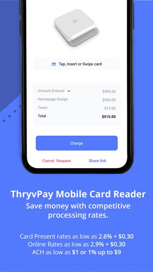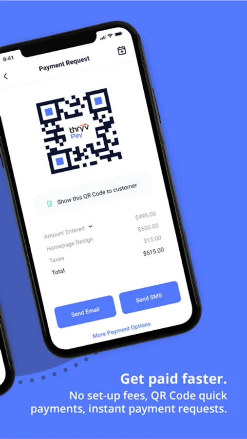 Getting paid faster has never been easier. ThryvPay lets you accept payments anywhere, anytime, with just a few clicks. ThryvPay mobile app is free to download with no hidden fees or set-up costs. Offer safe and secure contactless payments while providing convenience to your customers with the ThryvPay Mobile Card reader which offers on the go tap, insert and swiped credit card payment options, QR code payments and instant payment requests right from your mobile phone.