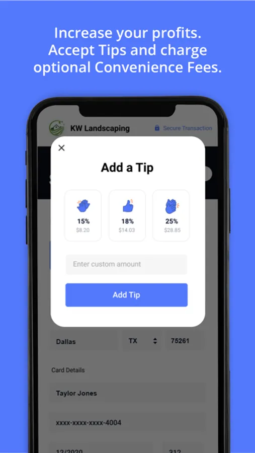 Create and save your customized services for easy management and organization. ThryvPay allows you to create instant payment requests for your saved paid services. Offer your customers flexibility by setting up automatic one-time payments or recurring payments to build customer loyalty. Allow optional tipping to increase profits for you and your staff.