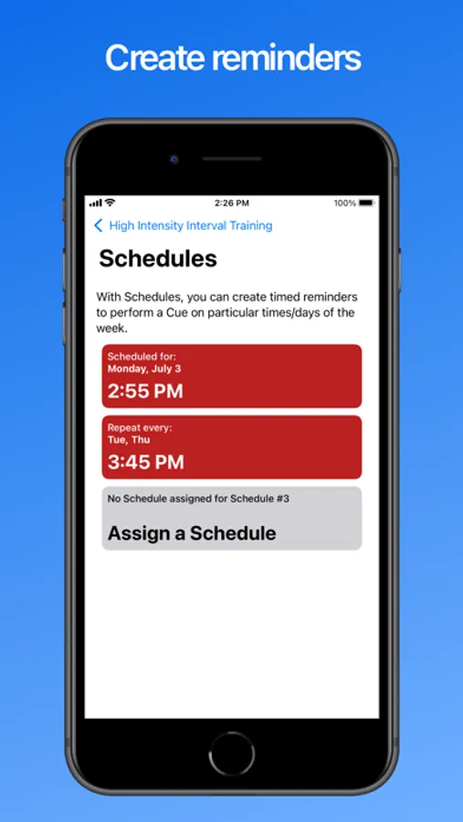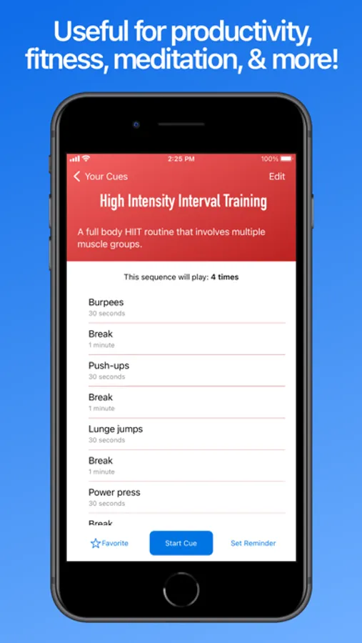 - Stay in shape: Create Cues for your fitness routines, with timers for each exercise and break