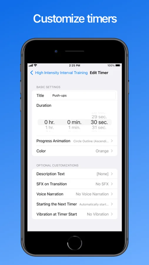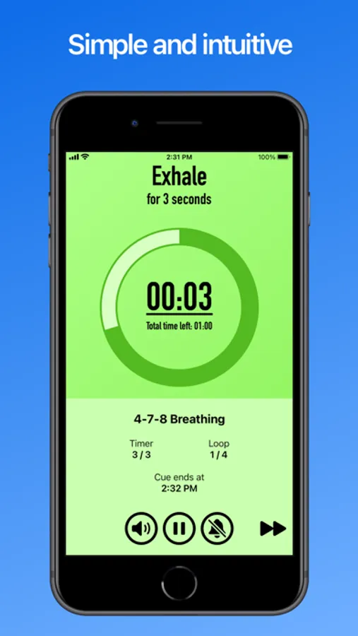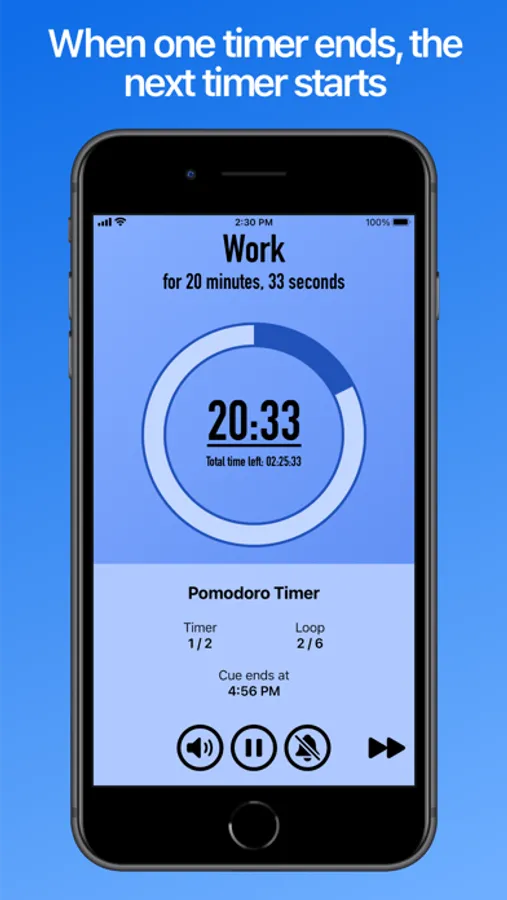 When you start a Cue, two countdown timers will be displayed - one for your current individual timer, and another for how much time is left in total. If you aren't able to keep constant focus on your device, you can also enable features such as Sound Effects, Vibrations, or Text-to-Speech Narration whenever a new timer starts.