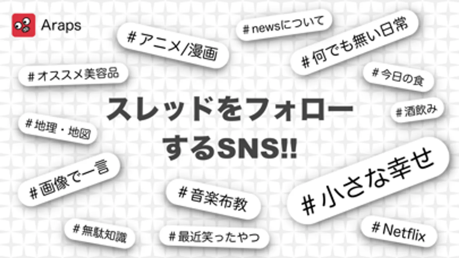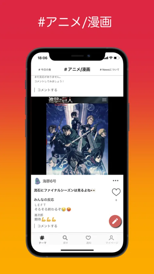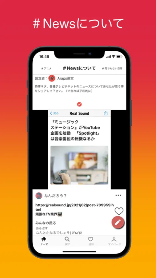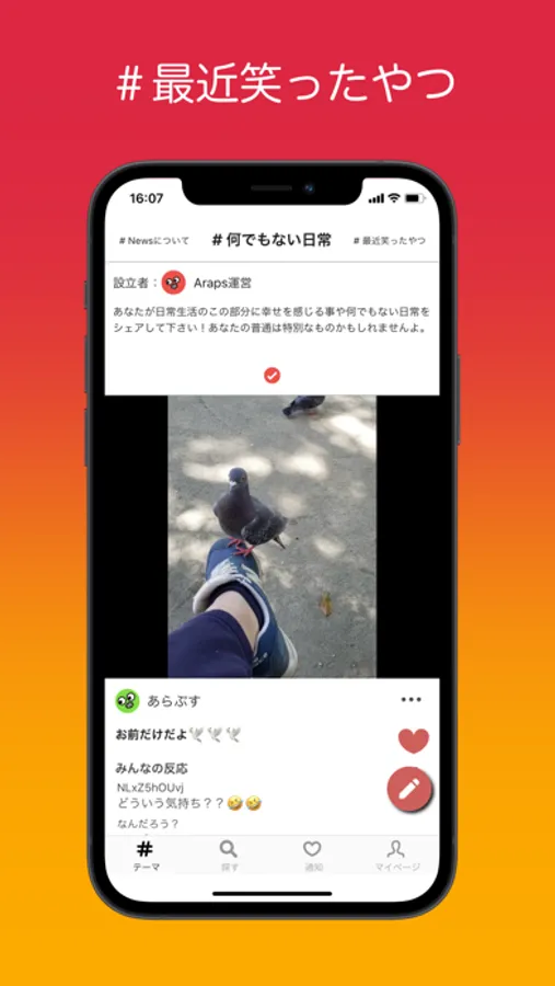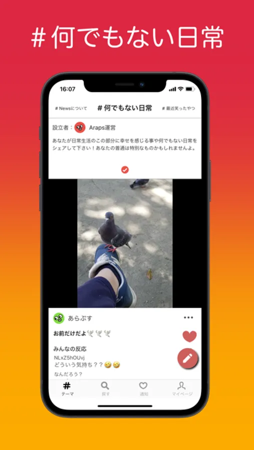 ・このアプリは、ユーザーアカウントではなく、#何でもない日常、#最近笑ったやつ、#アニメ等のいくつかのスレッドのタイトルに沿った投稿をシェアできます。
