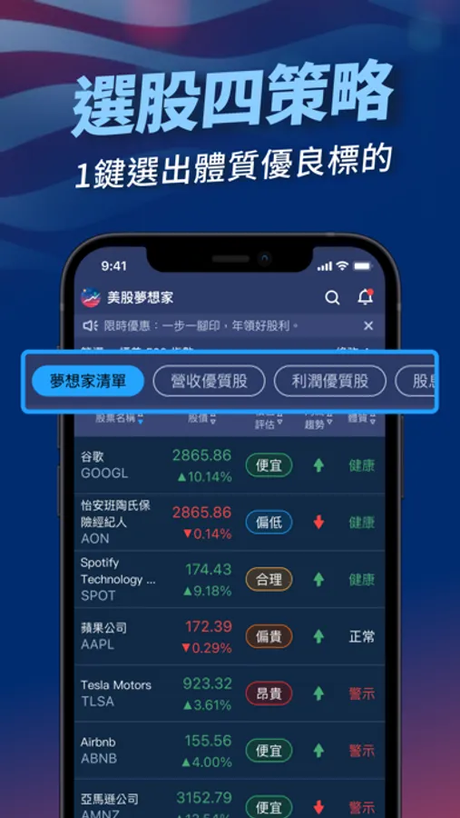 4大選股策略幫你從近萬檔美股標的做第一層篩選,分別依據營收、利潤、股息等面向替你找出具有成長能量的好股票。