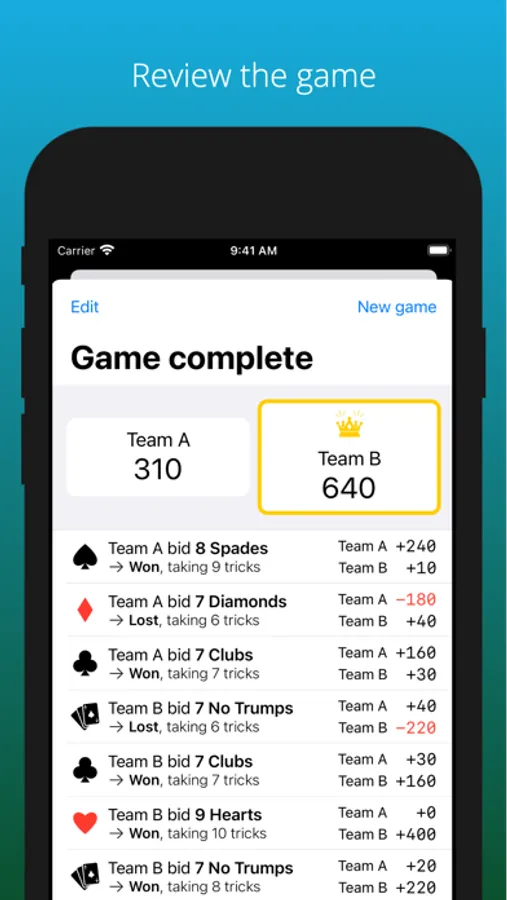 This app makes scoring 500 games easy. After each trick simply select the bid and number of tricks won and it'll take care of tracking the score.