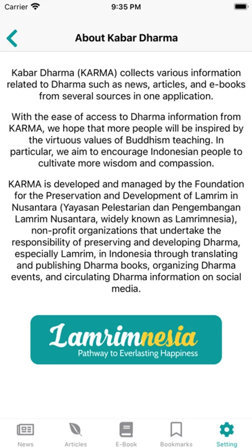 With the ease of access to Dharma information from Kabar Dharma (KARMA), we hope that more people will be inspired by the virtuous values of Buddhism teaching. In particular, we aim to encourage Indonesia people to cultivate more wisdom and compassion.