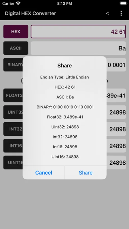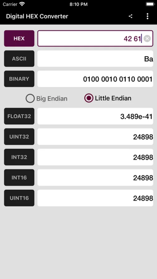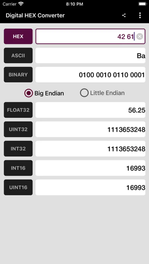 Digital HEX Converter app is designed for EASY, QUICK and SIMPLE conversions between ASCII, Hexadecimal, Binary into ints and floats of different bit significance.