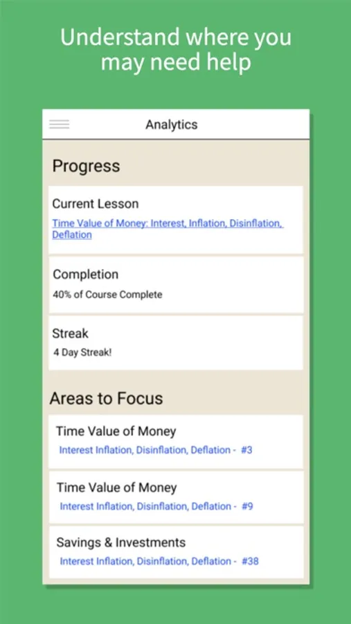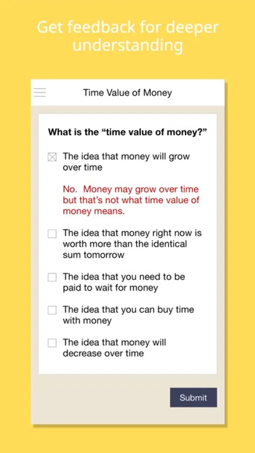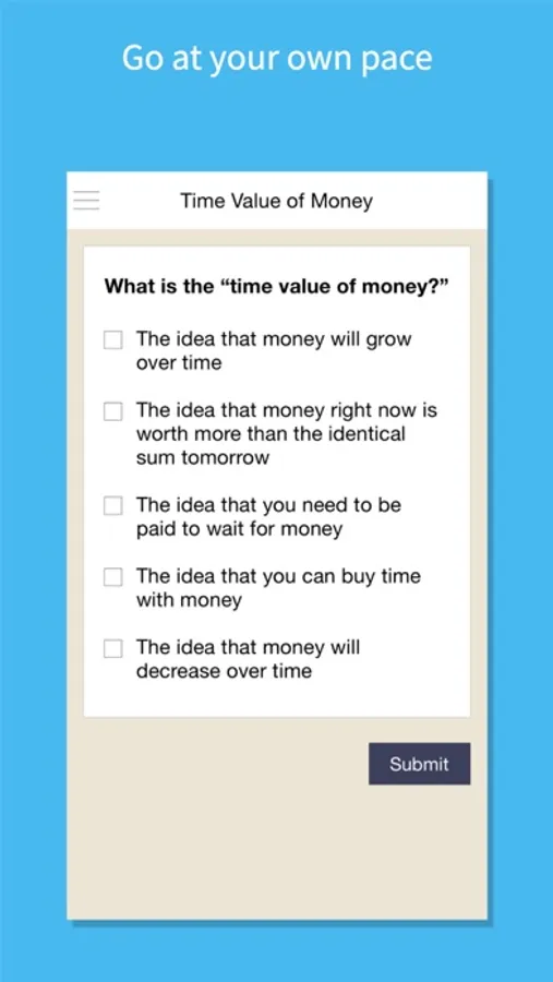 The app covers a broad range of topics so that when you finish this course, you will immediately be able to make more confident financial decisions. Topics include: