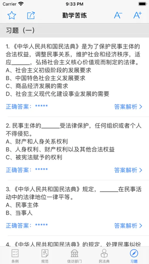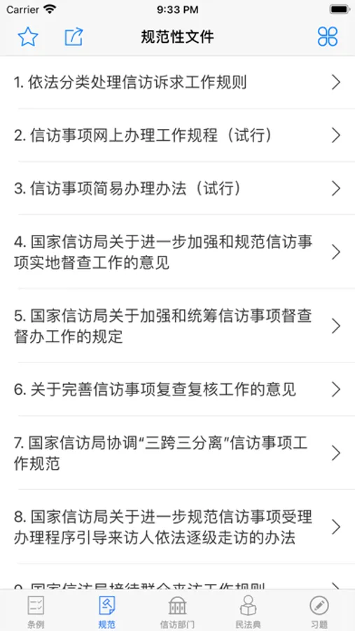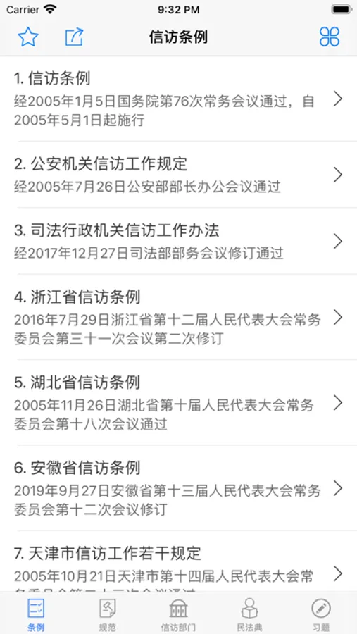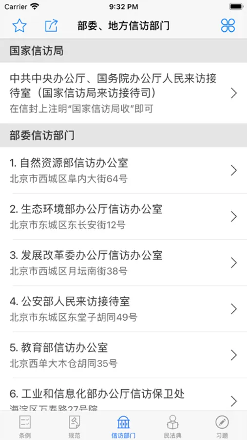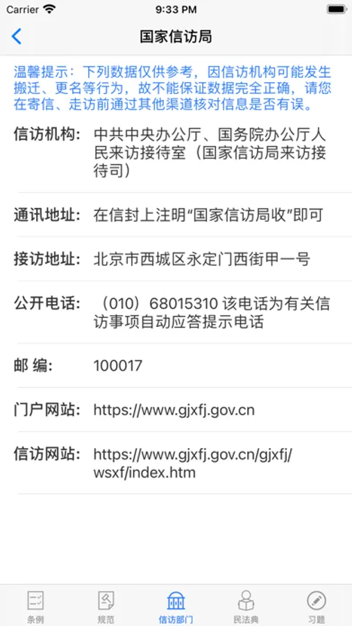 包含国家、省及直辖市33部信访条例,及17部规范性文件,并提供17个部委、32个省及直辖市信访部门联系方式。用户可以通过学习信访条例、法规提高信访认知、处理能力,信访部门联系方式方便用户邮寄、走访。额外提供《民法典》及习题,普及法律知识。