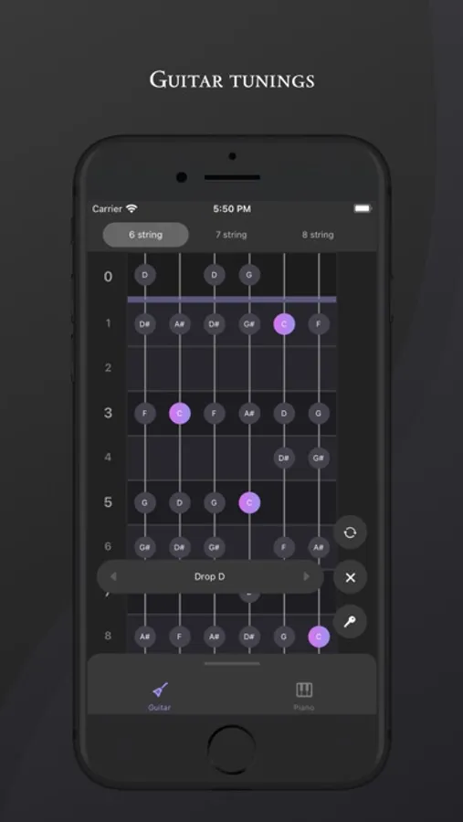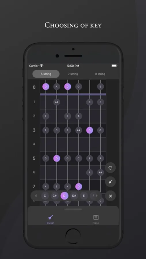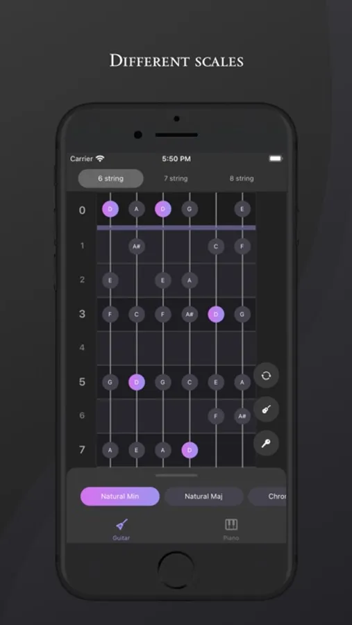 ProScale is an application that will help you learn the scales on your favorite instruments. Learn and memorize the location of notes on a guitar fretboard or piano keyboard.