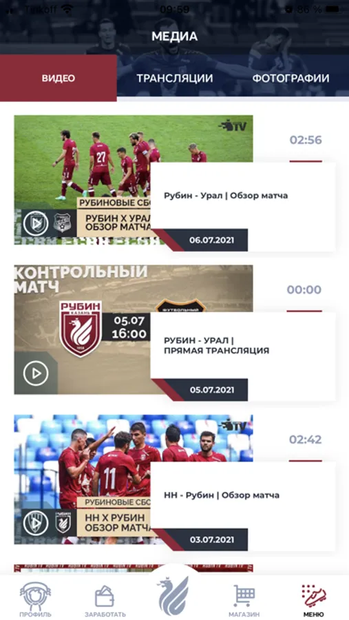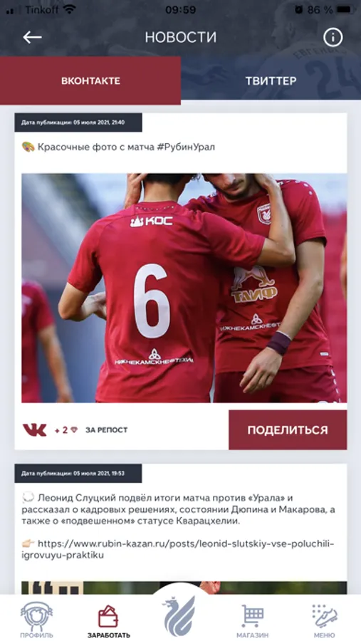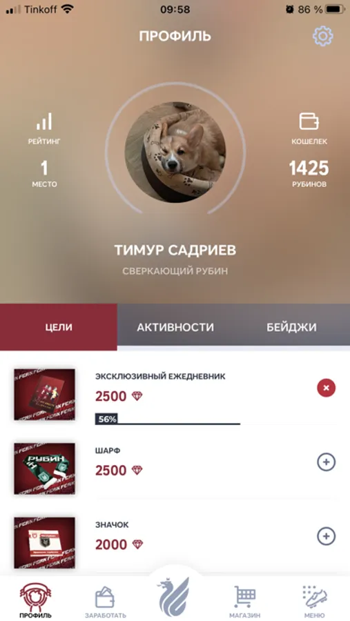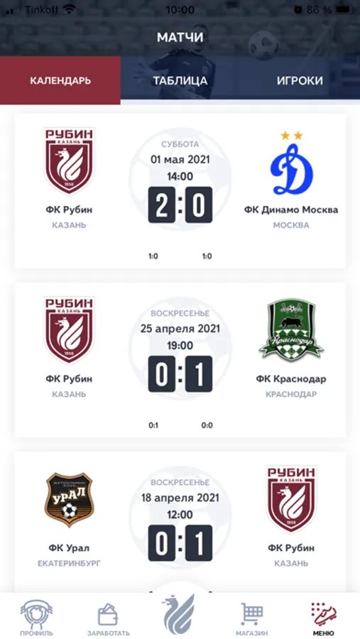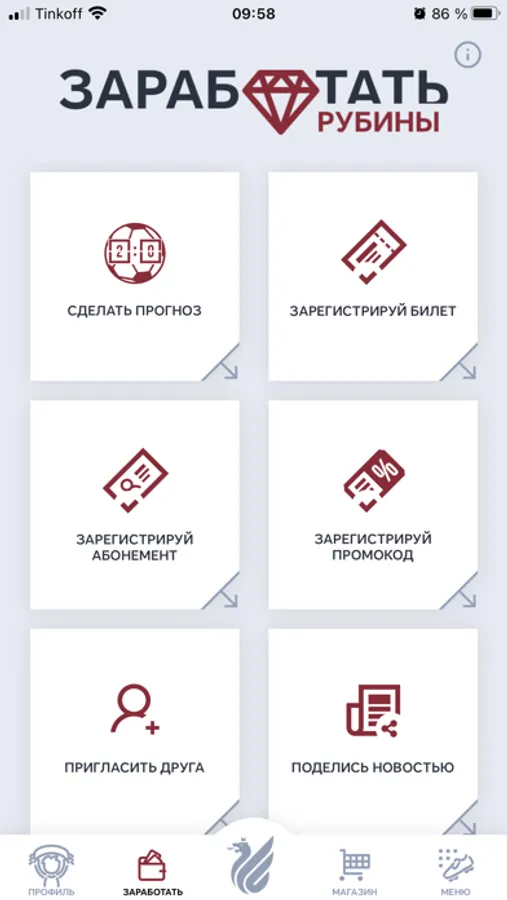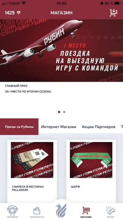 - Обменивай баллы на атрибутику и билеты на домашние матчи ФК «Рубин»;