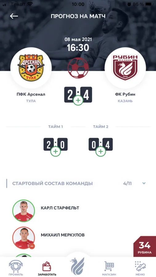 - Угадывай счёт каждого тайма, стартовый состав и авторов забитых мячей;