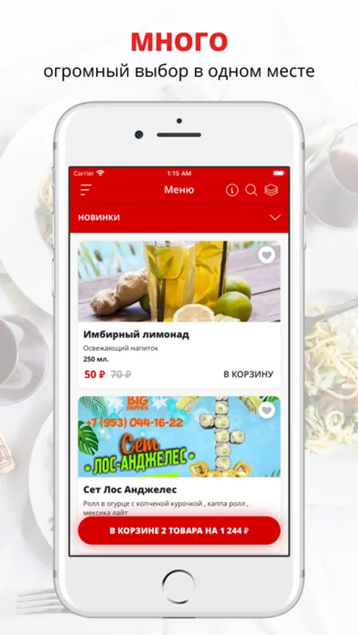 В приложении вы можете заказать нашу еду с доставкой на дом или в офис, а также: