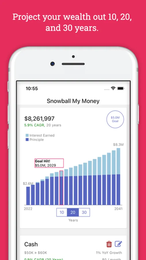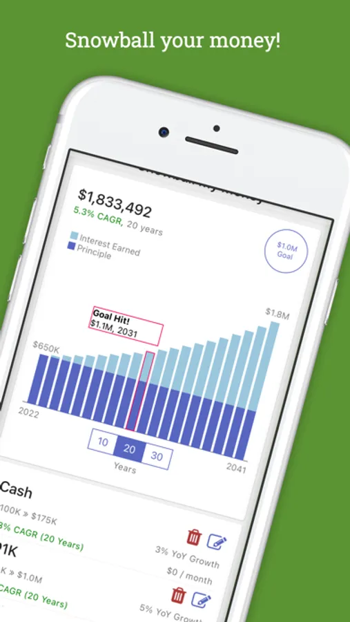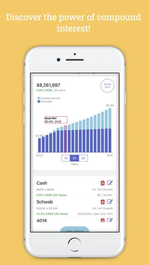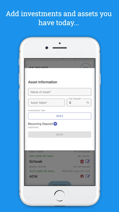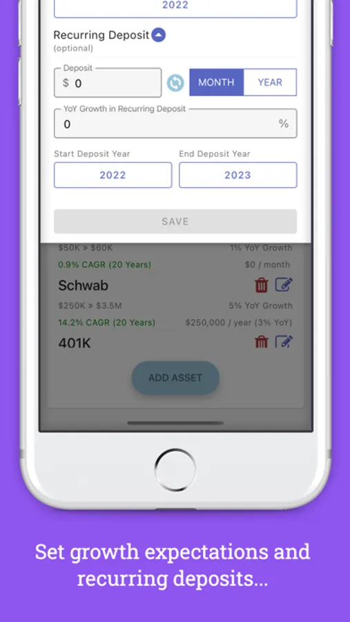 - play around with your rates of return and recurring deposits on your investments/assets to project out how each metric will impact your overall wealth