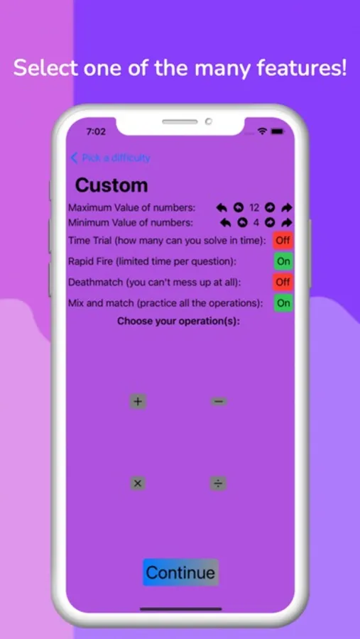 * Have fun in custom mode; practice in game modes such as rapid fire, time trial and death match, as well as choosing the minimum and maximum number values.