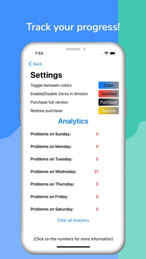 * Watch yourself progress as you can see the statistics for your practice weekly.