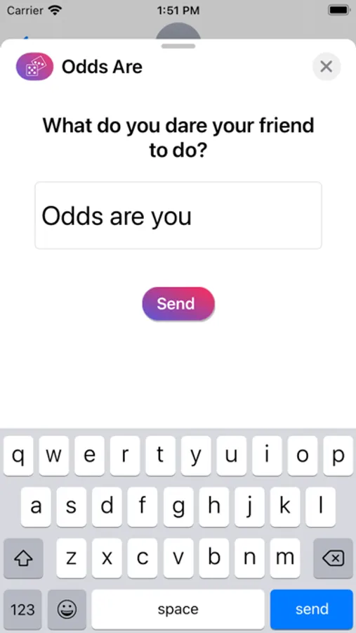 With the Odds Are for Messages app, you can play your favorite dare game right within the Messages app. Simply send your friend a challenge, let them set the maximum guess they're comfortable with, select a secret number, and watch your friend do something stupid! It's that easy.